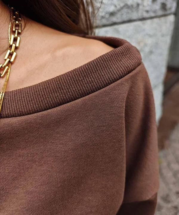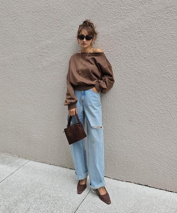 ボリュームのある袖とデコルテが見えるボートネックデザインで女性らしさをプラス。