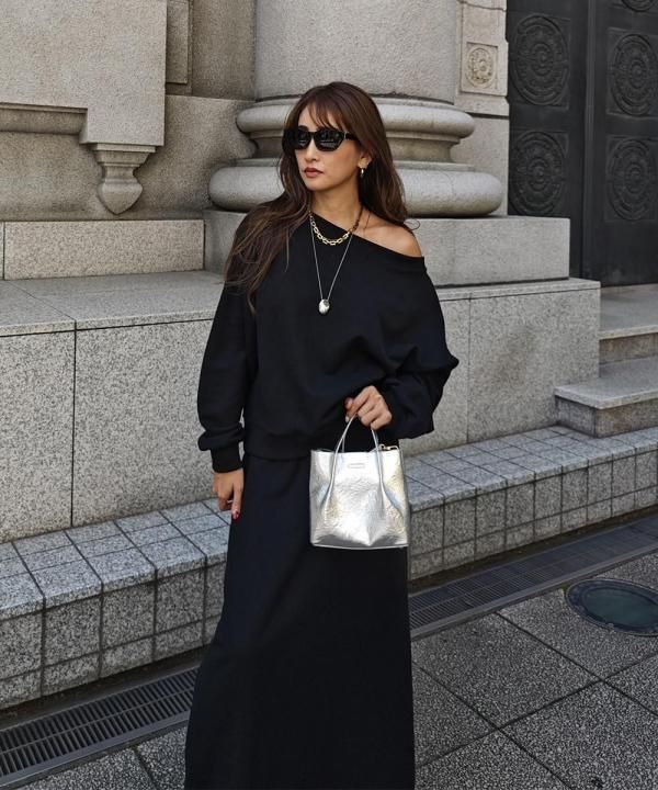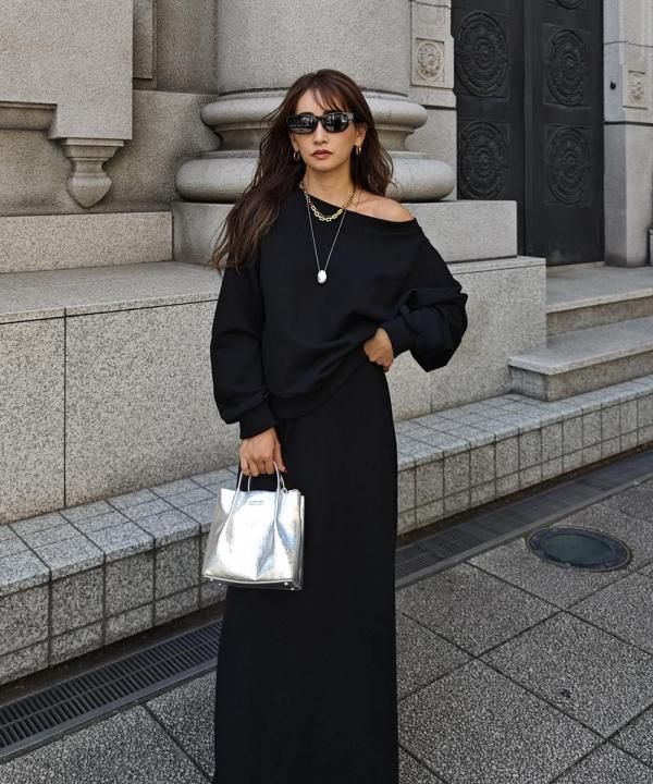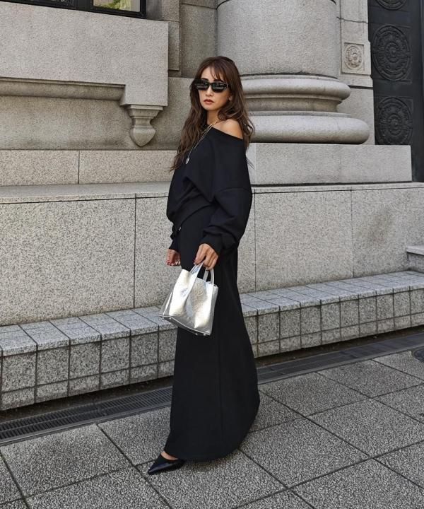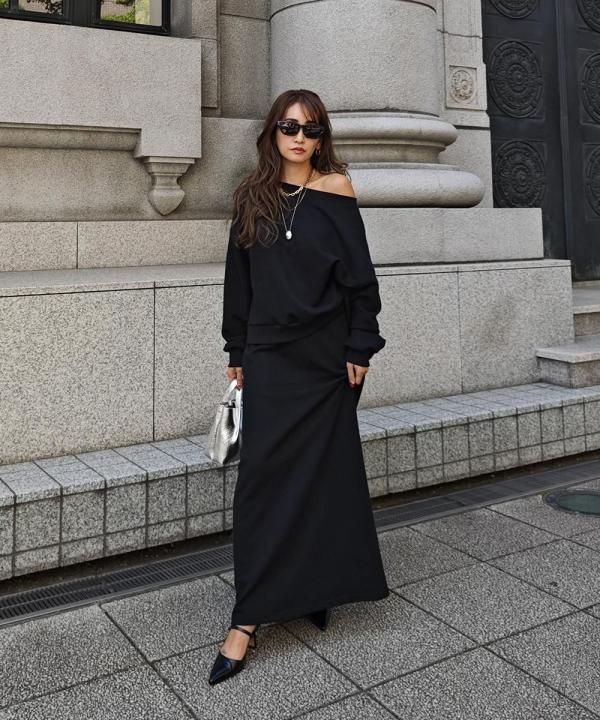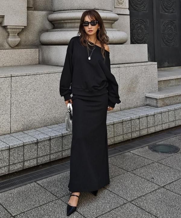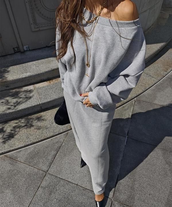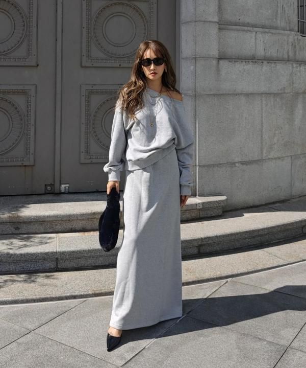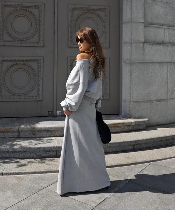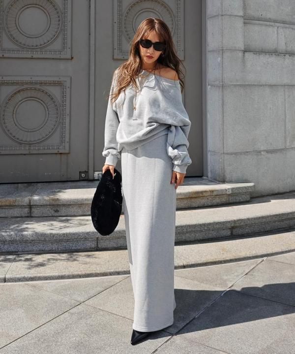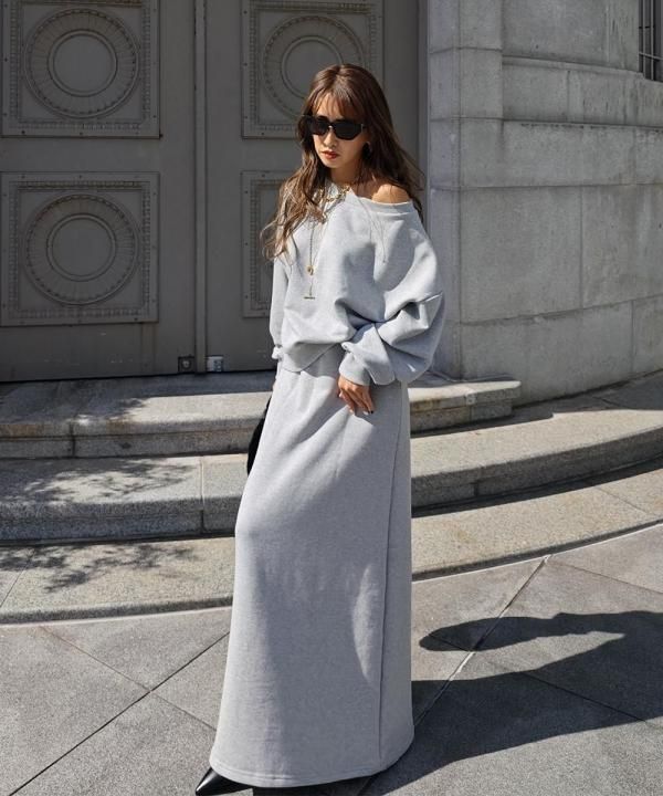 シンプルながらも女性らしさを引き立てるスウェット素材のセットアップ
