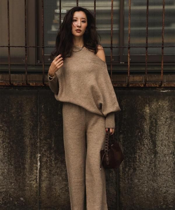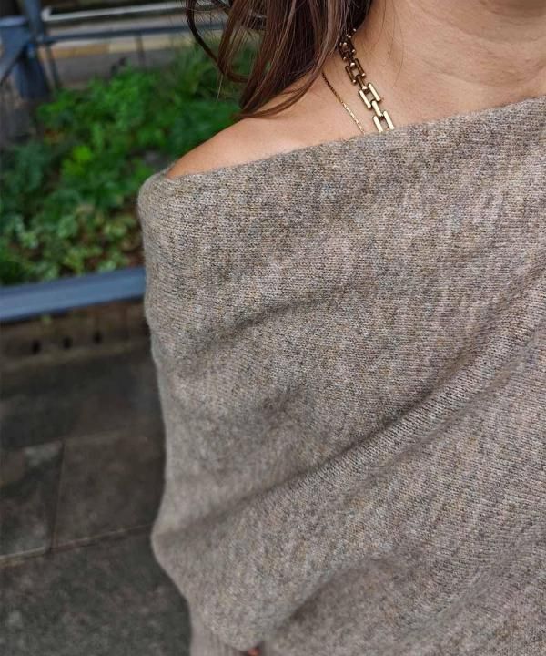 肩を落とさず着ていただくとネックラインがドレープ感あるデザインになり、落ち着いた雰囲気に。