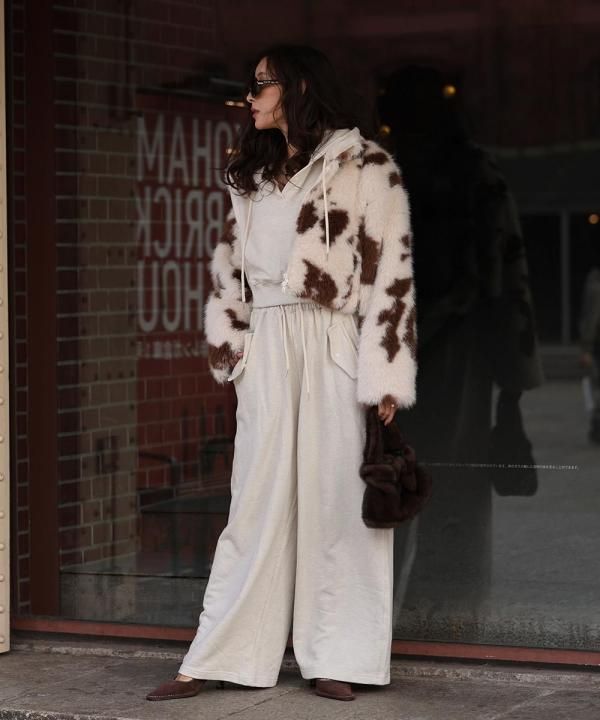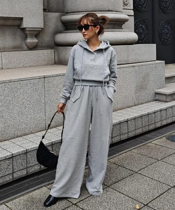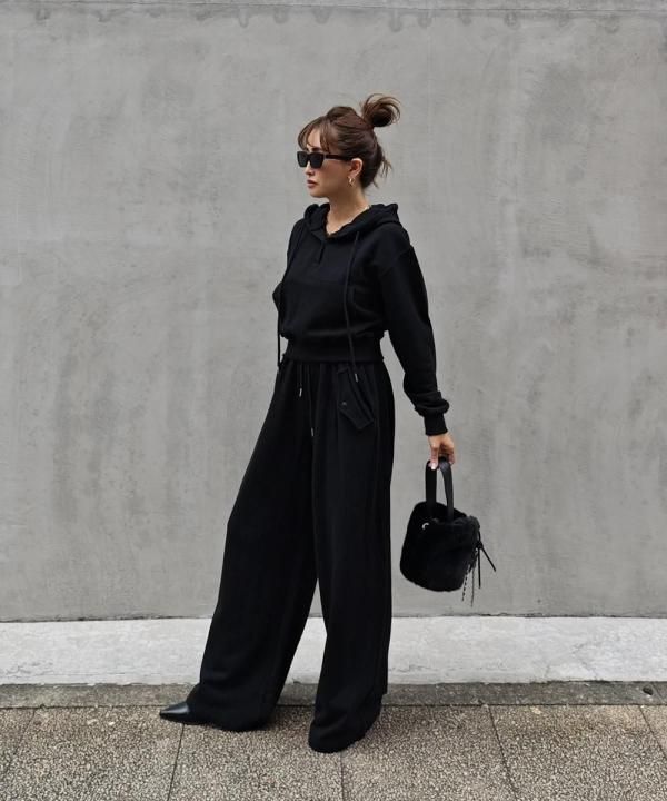ワイドパンツ×ショートフーディでメリハリのあるかっこいいデザインになっています。またスタイルアップ効果も♪