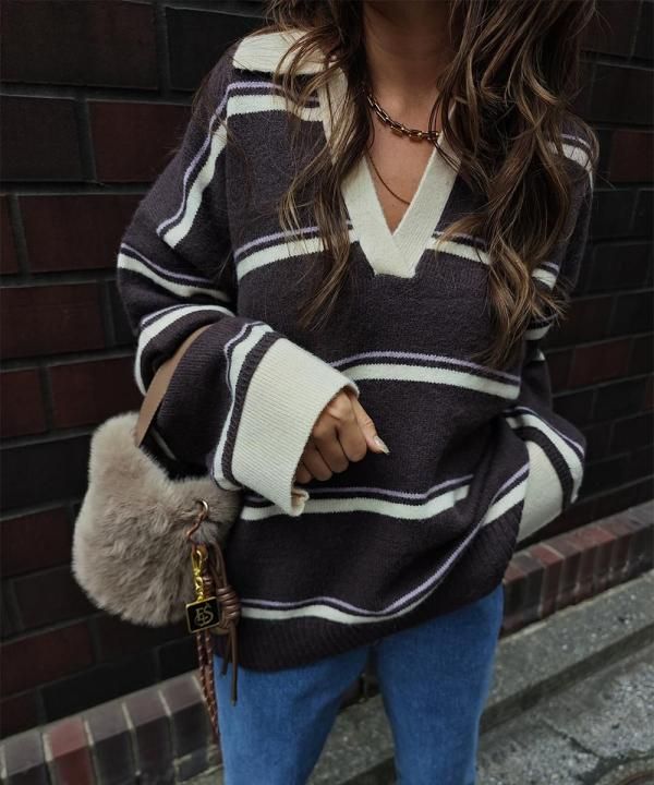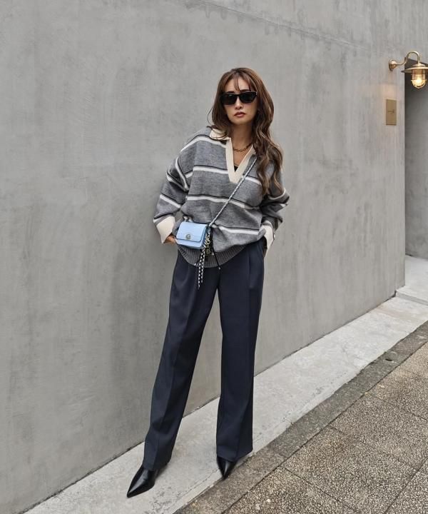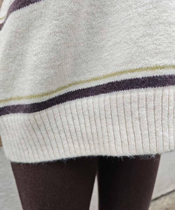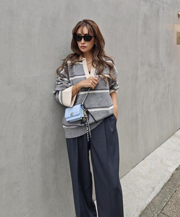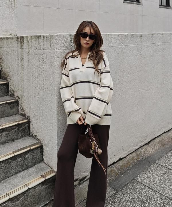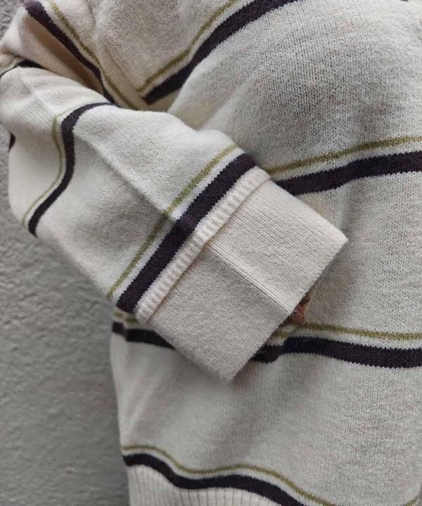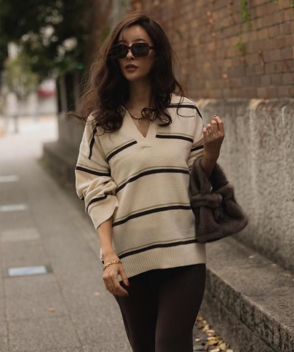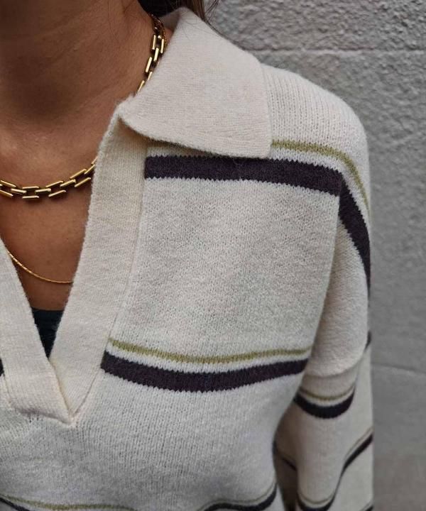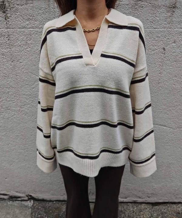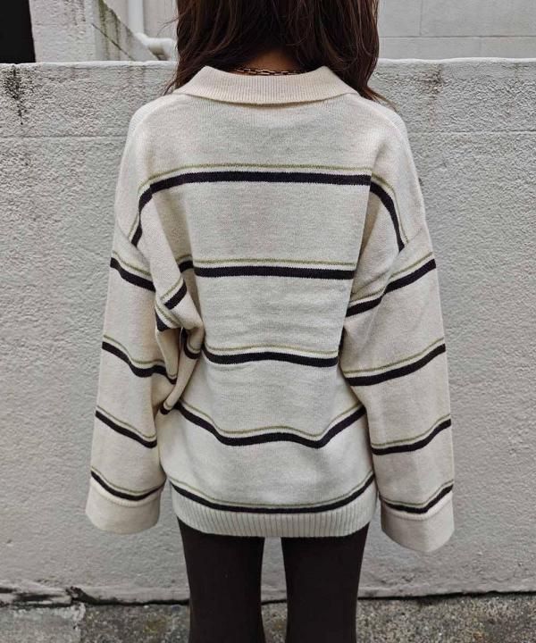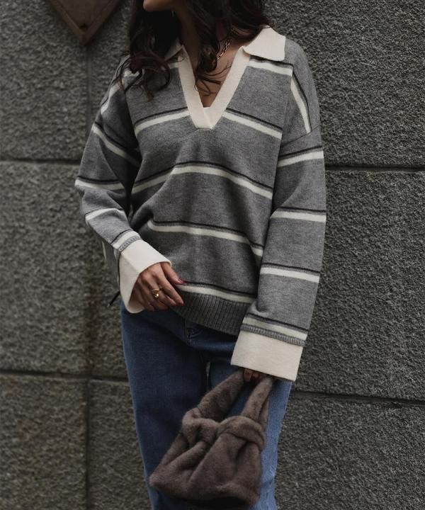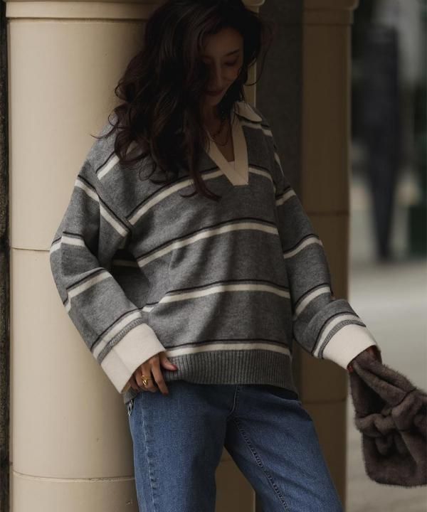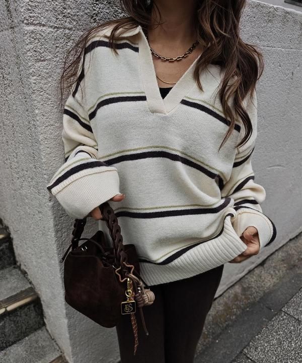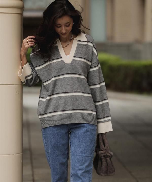 顔回りをすっきり見せてくれるスキッパーデザインのボーダーニット