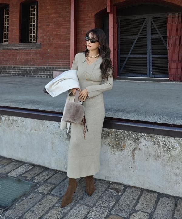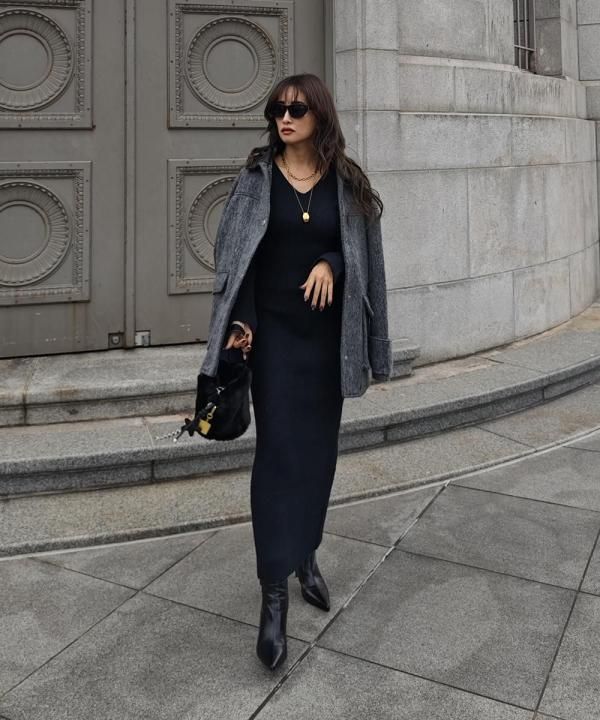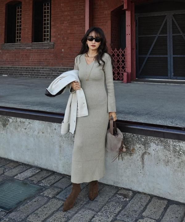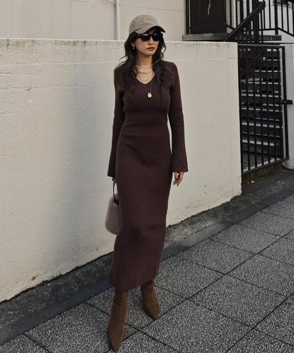すっきりとしたIラインシルエットと、長めのフレアスリーブが女性らしい抜け感を演出。