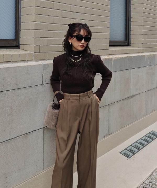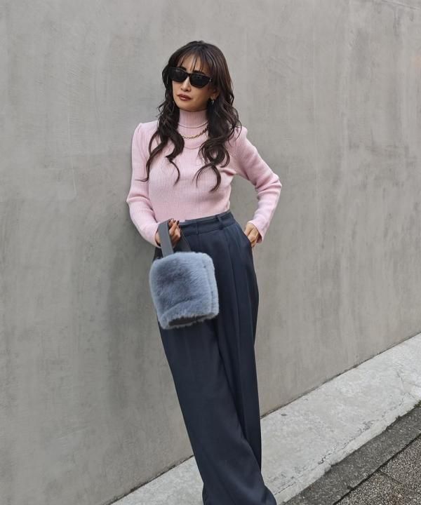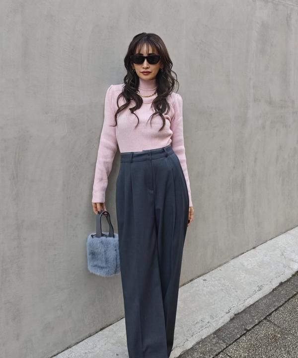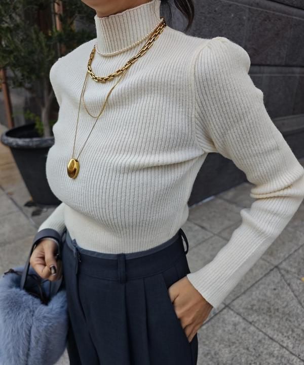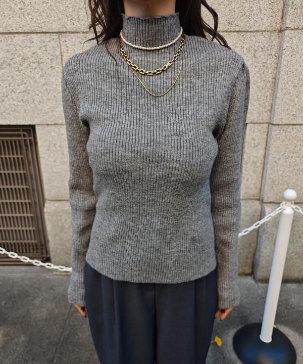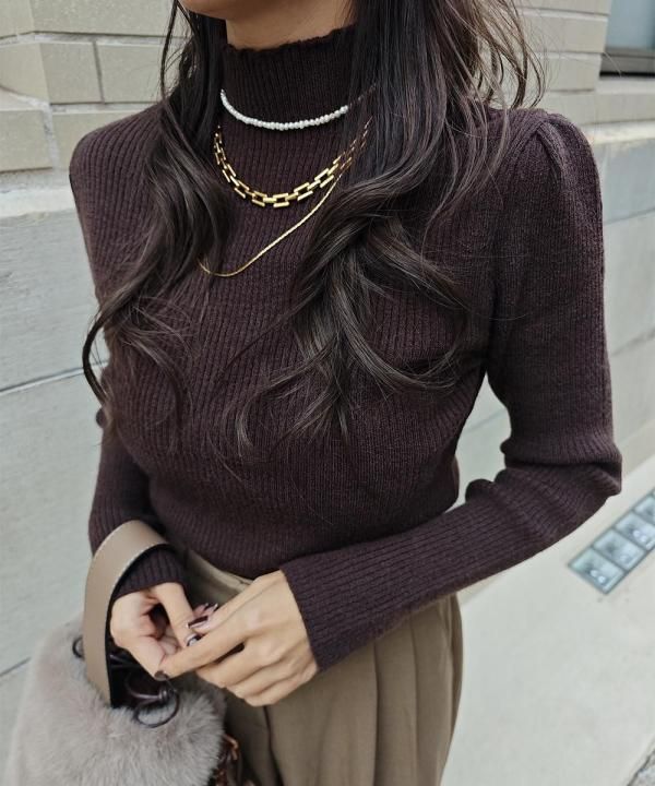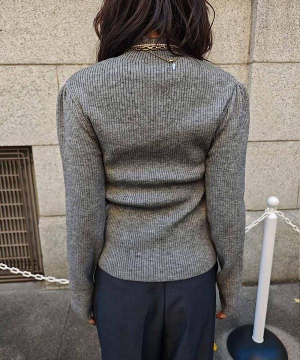 程よく体にフィットする細リブ素材に、華やかなパフスリーブと上品なハイネックをかけ合わせた1枚。