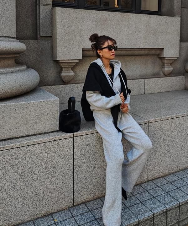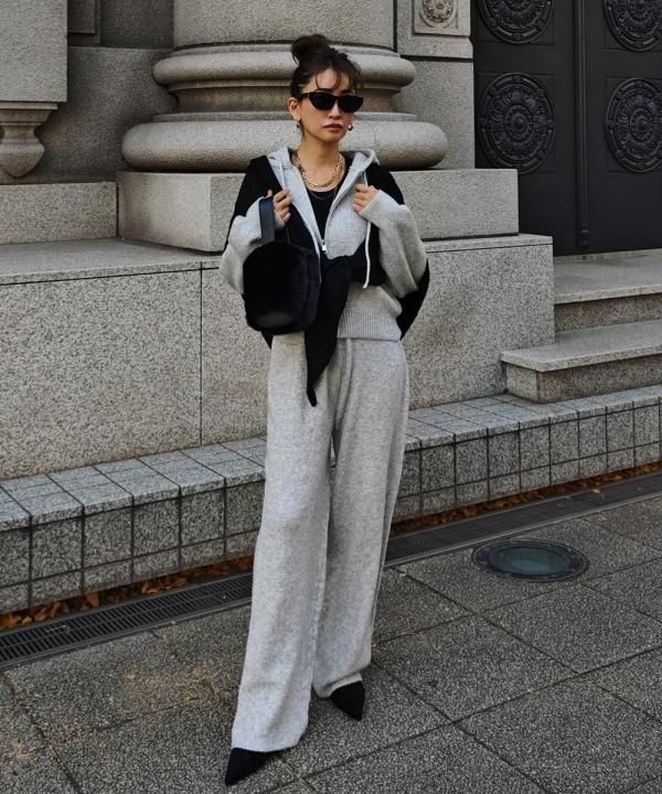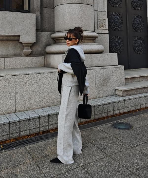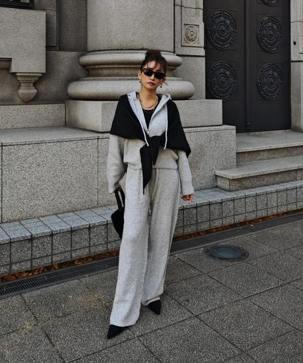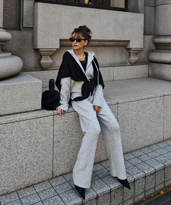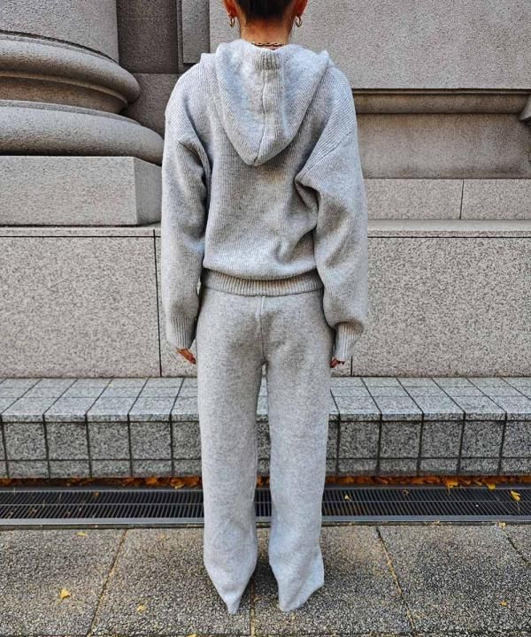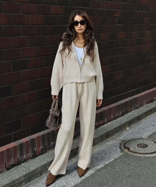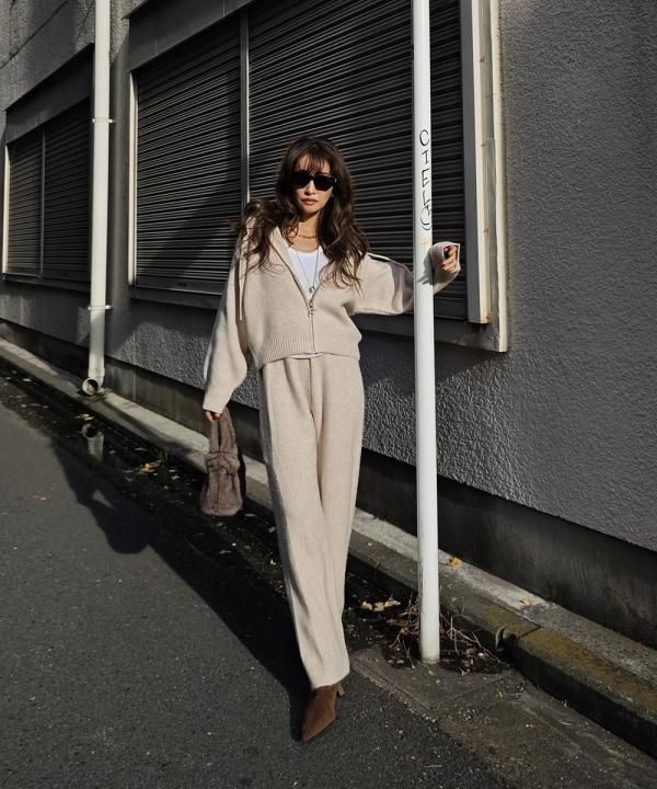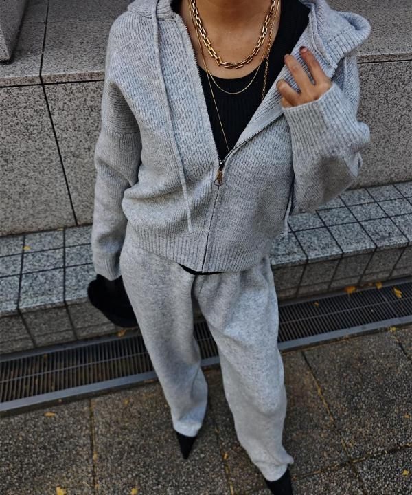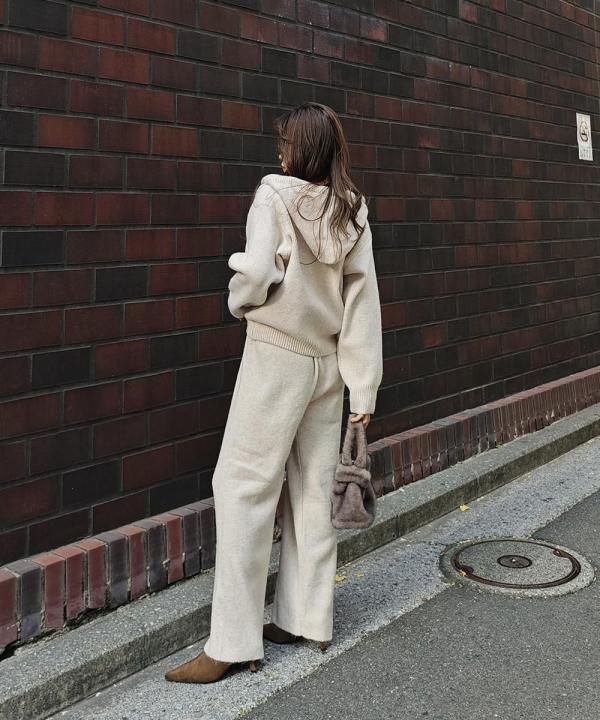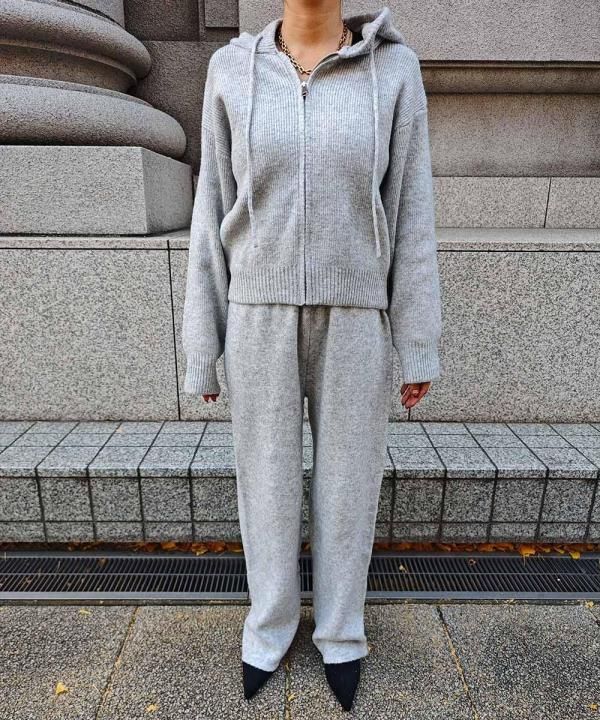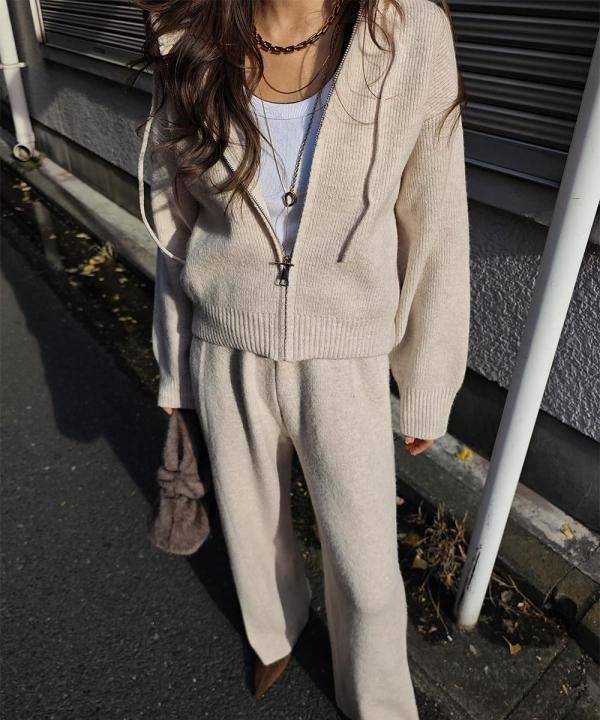ふんわりと柔らかなニット素材のフーディとパンツのセットアップ
